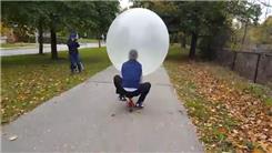 Drew Ripley rode a tiny bicycle 100 meters while his head was inside a six-foot diameter balloon.