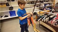 Finlay M. picked up four dice and placed them in a plastic cup using his foot in 9.34 seconds.