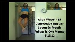 Alicia Weber completed 15 pull-ups in one minute while balancing an egg on a spoon held in her mouth.
