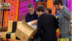Anna Simon, a host at Otra Movida, knocked down 48 cardboard boxes dressed as a hybrid human-cardboard battering ram.