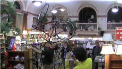 Travis Hugh Culley balanced an adult road bicycle on his chin for 28.81 seconds during a stop on the RecordSetter book tour.