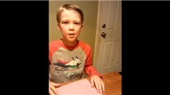 Noa O. stacked 12 hockey pucks in his hand. He is six years old.