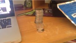 Demythrate stacked 21 coins on the edge of a coin standing vertically on another coin.