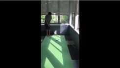 Chandler S. performed an elevated golf chip into a basketball hoop 30 feet high.