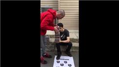 Pavol's partner stacked a plastic cup triangle using 10 cups on Pavol's arm.