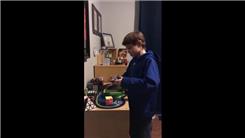 Jackson D. bounced a tennis ball on a tennis racquet six times while riding a pogo stick.