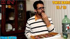 Naader Reda ate 18 regular-size Twix candy bars for a YouTube video. WARNING: Speed eating can be extremely dangerous. Please do... (more)