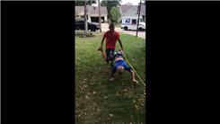Jay and Siah performed a human wheelbarrow run 92.5 feet in distance in 15 seconds.