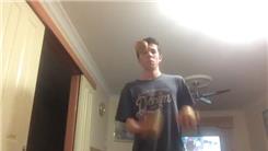 Demythrate flashed four golf balls in a juggler's tennis pattern while standing on a basketball.
