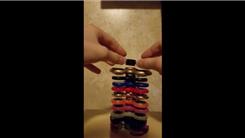 Greyson R. stacked 13 fidget spinners in a tower.