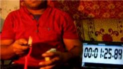Kamal A. performed a "Saber's Double Trouble" card cut in 4.49 seconds while spinning a toothbrush on a pen.