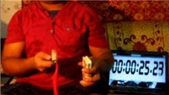 Kamal A. performed a "Thumb" card cut in 0.59 second while spinning a toothbrush on a pen.