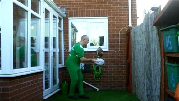 Mark E. balanced an American football on top of a rugby ball for three minutes, 2.53 seconds.