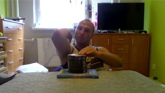 Pavol Durdik stacked 25 CDs on his elbow in 30 seconds.