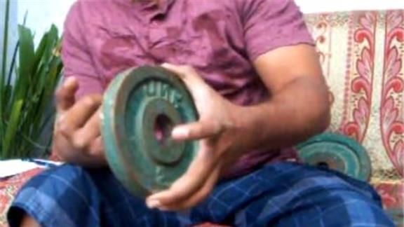 Kamal Aslam performed ten Kryptonite card cuts in 30 seconds while holding a 5-pound exercise plate on his pinky finger and a 15-pound exercise plate on his index finger.