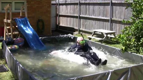 Berg completed eight laps in one minute riding an inflatable tube in a four-meter do-it-yourself paddling pool while wearing a three-piece suit.