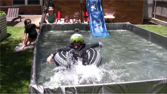 Tobin A. completed nine laps in one minute riding an inflatable tube in a four-meter do-it-yourself paddling pool while wearing a three-piece suit.