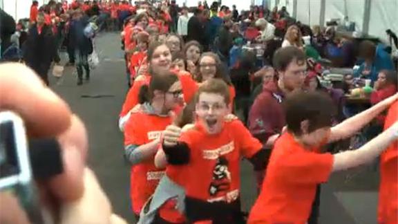 132 Durham Scouts danced in a conga line while wearing identical shirts.