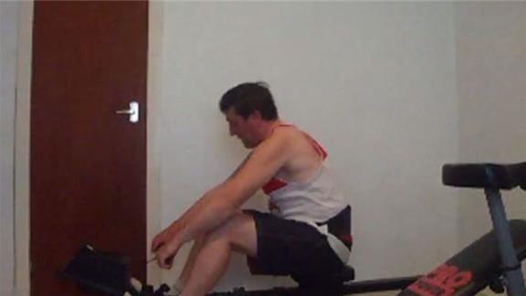 William Cannon completed 10 strokes stationary rowing while holding a 45-pound dumbbell with his left hand above his head.