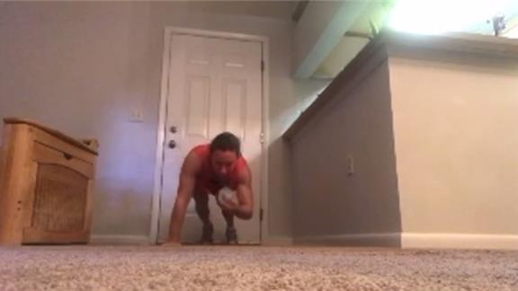 - must throw bean bag to one hand and catch it then jump forward and back and then push-up for a rep to count