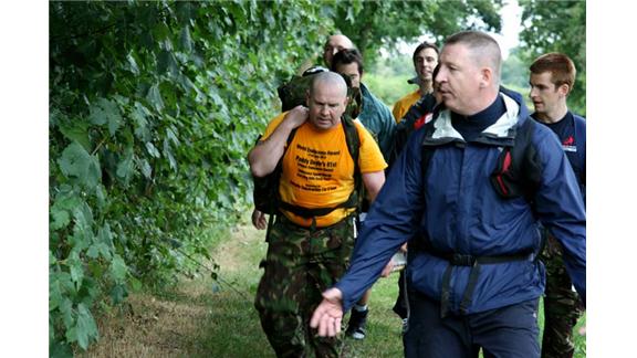Paddy Doyle walked 30 miles along the Grand Union Canal while carrying a 76-pound back pack in 10 hours and 37 seconds. Though his pack was 76 pounds and he walked an additional 300 meters, the weight and distance have been standardized.
