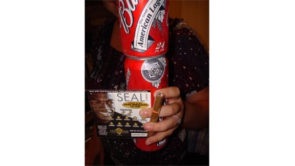 Amber Franklin held two 24-ounce cans of Budweiser in one hand while also holding an Optimo cigar and a lottery ticket.