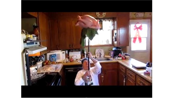 Doug Mcmanaman balanced a 40-pound turkey on his chin for 8.34 seconds. The turkey was placed on top of a dish that was fixed to a 3-foot pole.