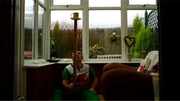 Mark Evans balanced a cup of tea atop a three-foot pole on the edge of his thumb for eight minutes, 56.35 seconds.