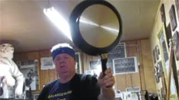 Doug McManaman balanced a frying pan on top of a walking cane on his chin for one minute, 57.23 seconds.