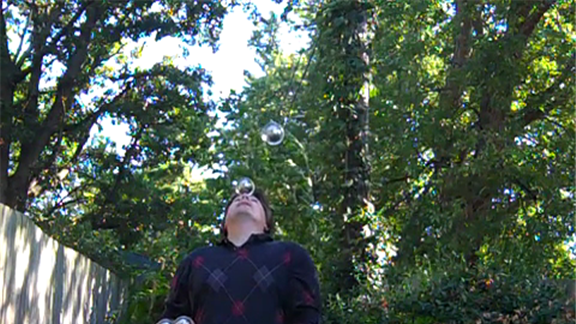 seconds while palm spinning two Fushigi balls in one hand and juggling