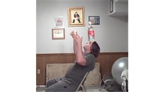 Brian Pankey balanced a two-liter bottle of water with an egg on top on his forehead for one minute and 50.37 seconds.