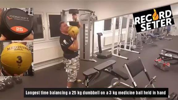 Longest Time Balancing A 25-Kilogram Dumbbell On A 3-Kilogram Medicine Ball On Palm