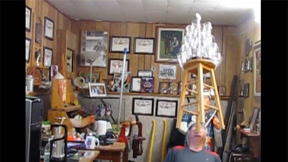 Doug McManaman balanced 25 wine glasses on a hardwood stool on his chin for 46.43 seconds while kneeling.