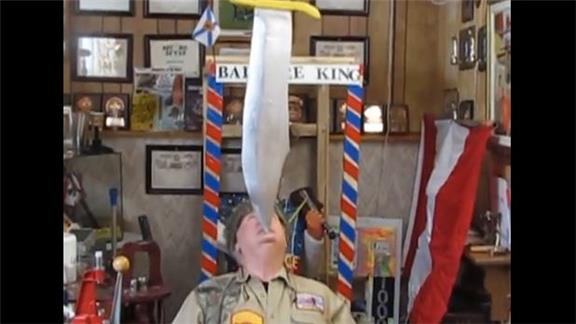 Longest Time Balancing A 3.5-Foot Bowie Knife Replica On Chin While Kneeling
