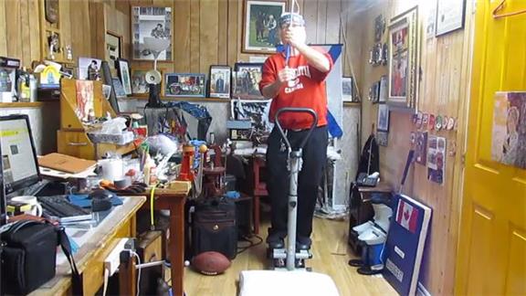 Doug McManaman balanced an egg on a selfie stick on his thumb for three minutes, 12.36 seconds while stepping on a stepping machine.