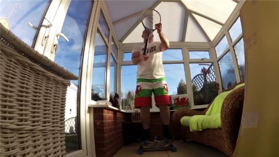 Mark Evans balanced an egg on a spoon held in his mouth and a tennis racquet on his finger for four minutes, 41.21 seconds while stepping on a stepper machine.