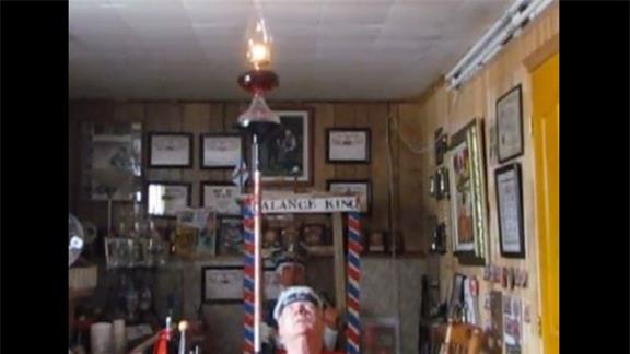 Doug McManaman balanced an oil lamp on his thumb for three minutes, 27.28 seconds while kneeling.