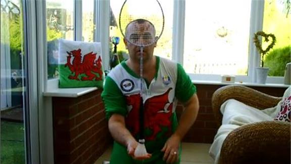 Mark Evans balanced a badminton racquet on a shuttlecock held in his hand for nine minutes, 45.08 seconds while kneeling.