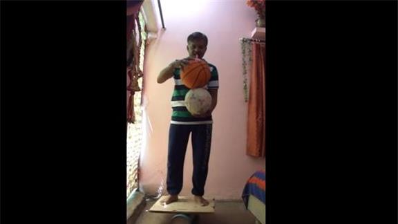 Suresh Gaur balanced a basketball on top of a soccer ball on his left hand spun a toothbrush on his right hand for three minutes, 58.11 seconds while on a rola bola.