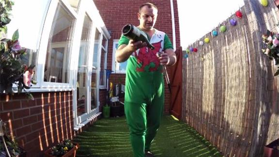Mark Evans balanced a champagne bottle on top of a solar light on his thumb for six minutes, 54.53 seconds.