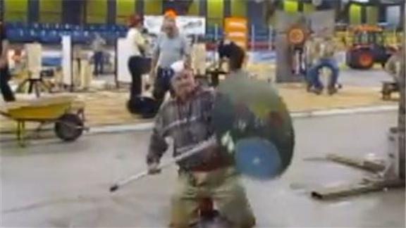 Doug McManaman balanced a circular saw on his chin for 38.50 seconds.