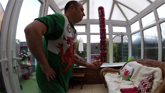 Mark Evans balanced five cans on his left ring finger for eight minutes, 2.43 seconds.