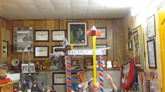 Doug McManaman balanced four golf balls on top of a four-bitted ax on his chin for 47.46 seconds while kneeling.