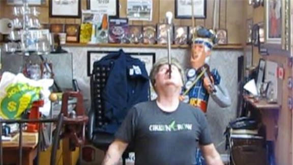 Doug McManaman balanced a golf ball on top of a solar light on his chin for one minute, 44.29 seconds while kneeling.