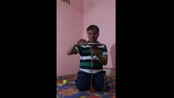 Suresh Gaur balanced a table tennis paddle on top of a screwdriver on a tennis ball held in his hand for 10 minutes, 53.12 seconds while standing on his heels.