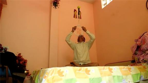 Suresh Gaur balanced a tennis ball on top of a badminton racquet handle on his chin for 43.07 seconds while holding a lotus pose.
