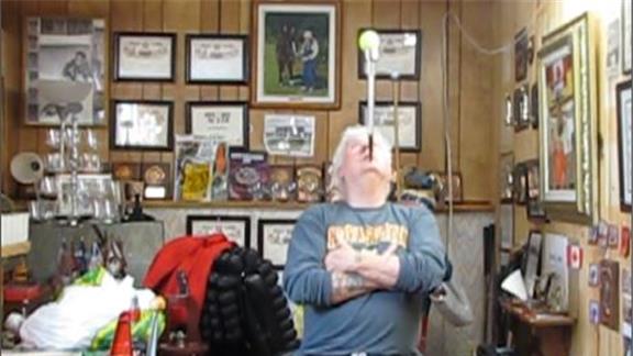 Doug McManaman balanced a tennis ball on top of a solar light on his chin for one minute, 50.53 seconds while sitting.