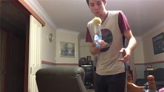 Brendan Kelbie balanced a tennis ball on top of a water bottle on one finger for seven minutes, 56.44 seconds.