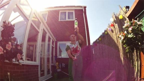 Mark Evans balanced a wine bottle and a badminton racquet on top of a shuttlecock held in his hand for five minutes, 38.09 seconds.