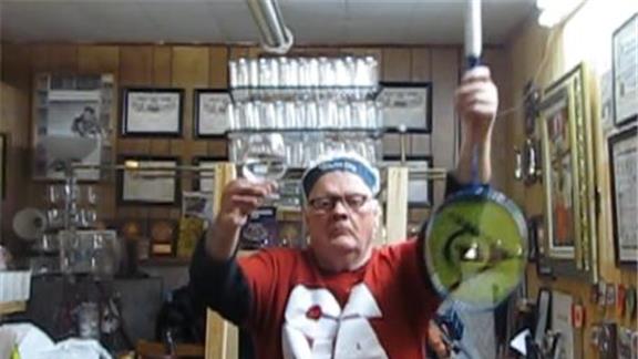 Doug McManaman balanced a wine glass on top of a badminton racquet handle on his chin for one minute, 15.38 seconds while sitting.